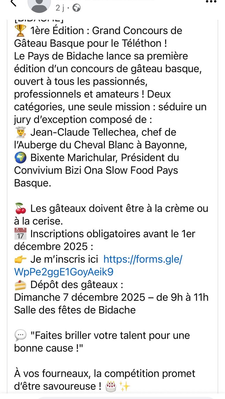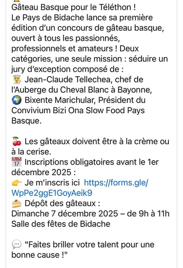 A l'occasion du Téléthon, Bidache organise son premier concours de gâteau basque le dimanche 7 décembre!!!!